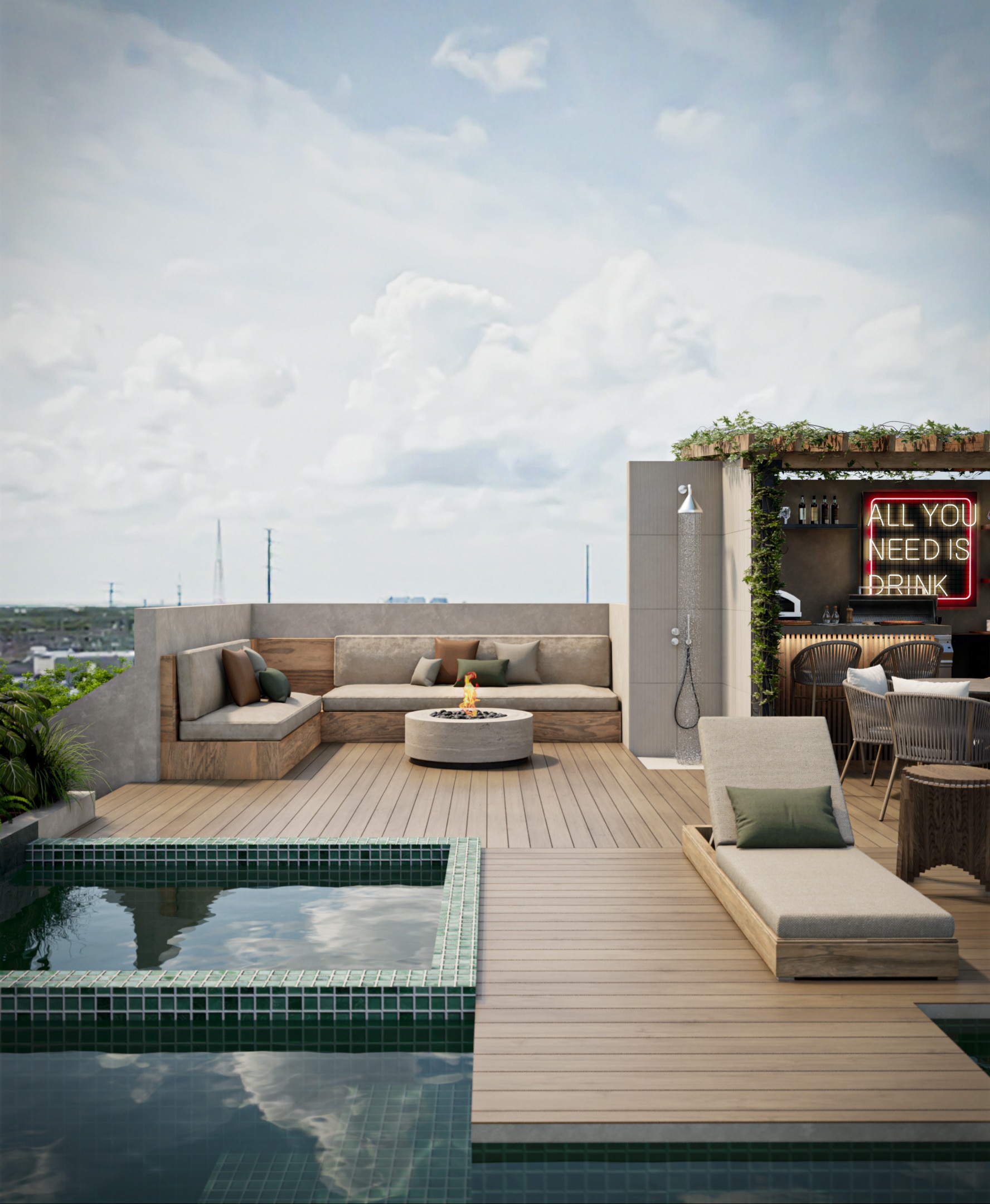 - Social and Fitness Areas, including a gym and BBQ zones.